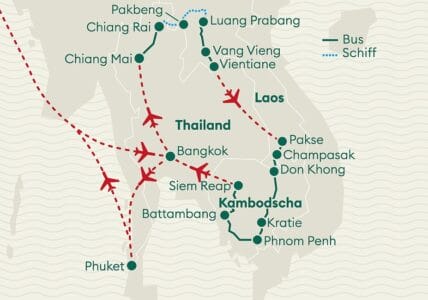 In einigen Regionen der von Ihnen besuchten Länder (Laos, Kambodscha, Thailand) besteht ein geringes Malaria-Risiko. Schützen Sie sich auf der ganzen Reise vor Mückenstichen.